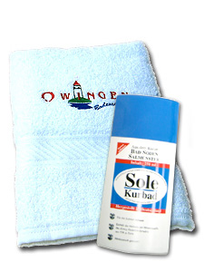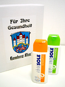 | Artikel Nr.: ZW00001 Sole Kurbadset mit Handtuch Set bestehend aus Frottierhandtuch 50 x 100 cm inkl. Stick Wappen /Emblem od. Text, inkl. Sole Kurbad. Alternativ erhältlich mit: Sole Kurschampoo, Sole Duschgel 2 in 1 oder Sole Cremeseife. | Artikel Nr.: ZW00003 Sole Fit Pflegeserie 2er Im Geschenkkarton mit mehrfärbigen Wappen od. Emblemaufdruck sowie Text nach Ihren Angaben. Erhältlich im 2er Pack zusammengestellt aus: Sole Kurbad, Sole Kurschampoo, Sole Duschgel 2 in 1 oder Sole Cremeseife. |